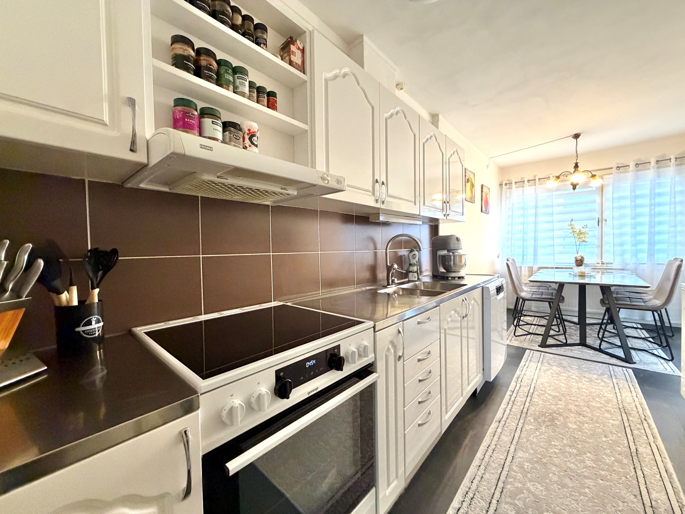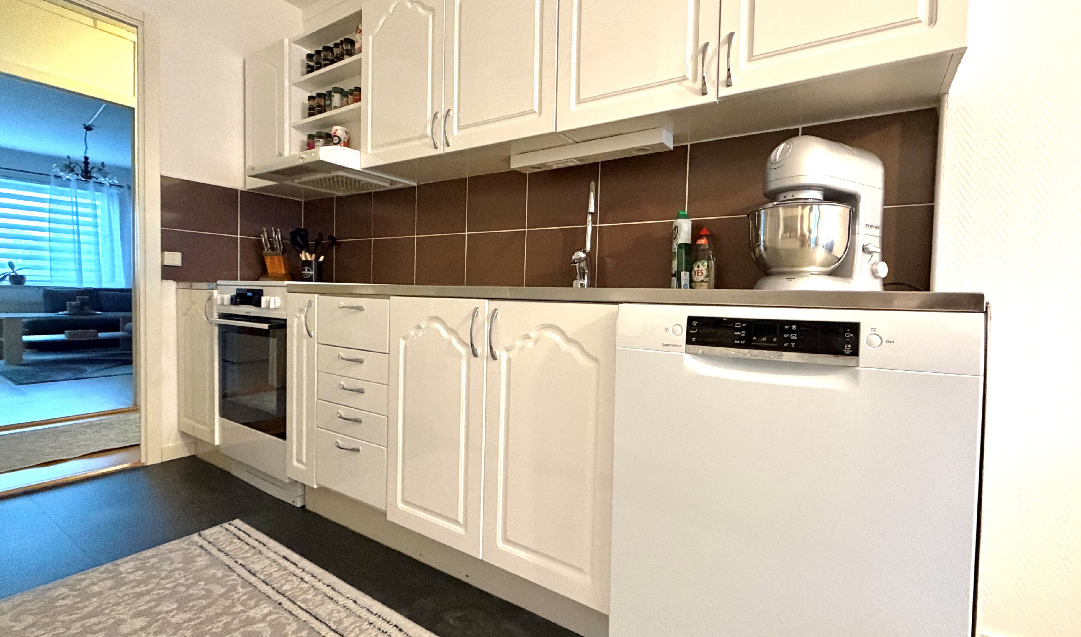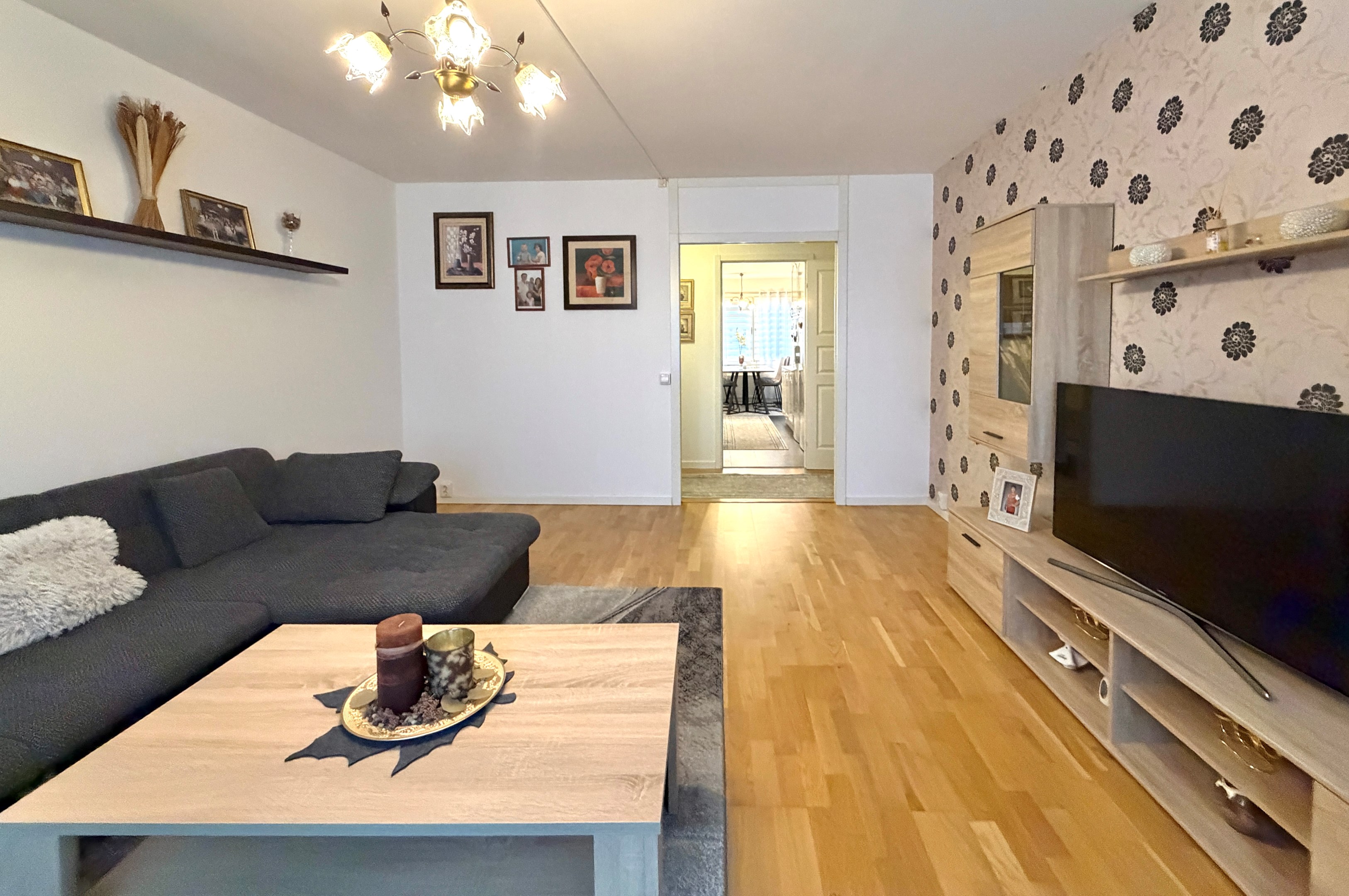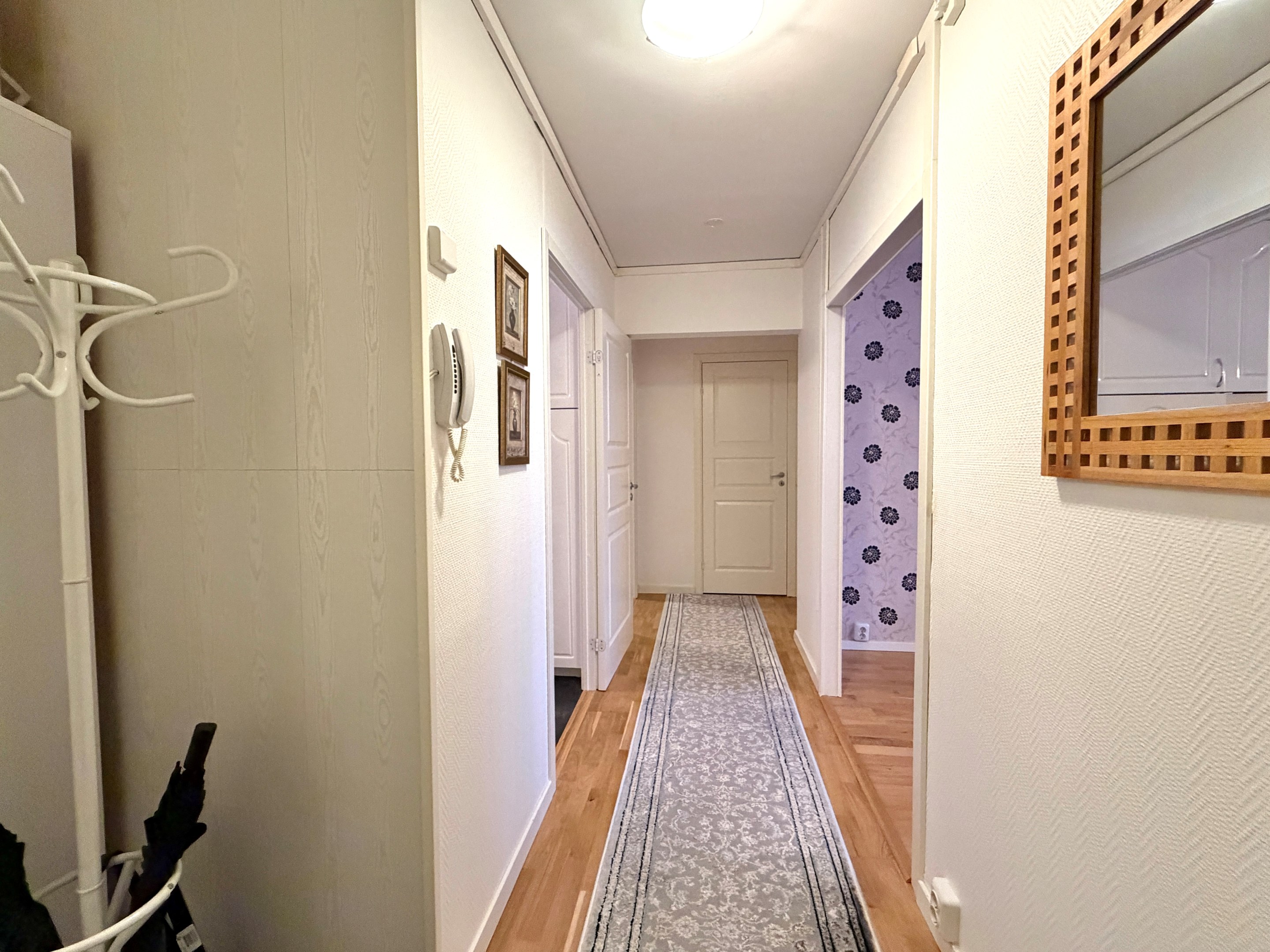 Genomgående och ljus lägenhet. Köket har plats för minst 4 sittande, de två sovrummen är lika stora, mellan dessa finns en praktisk klädkammare, vardagsrum med parkettgolv, badrum med egen tvättmaskin samt torktumlare, (gemensamma tvättstugor finns också)